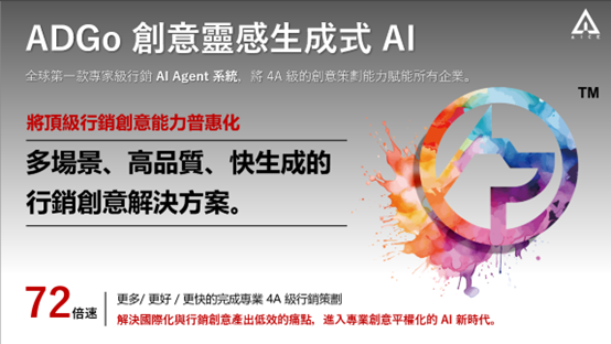由 AICE Inc. 推出的旗艦產品 ADGo,透過獨創的 AI-Generated IDEA(AIGI)與多智慧體共創工作流(M.A.G.I.C.C.),實現行銷策略與創意內容的一站式自動生成。系統整合超過 60 個具備專業知識的行銷 AI 智能體,結合 RAG 知識調用與深度推理技術,讓 AI 不僅能產出文案,更能制定策略與調研判斷。