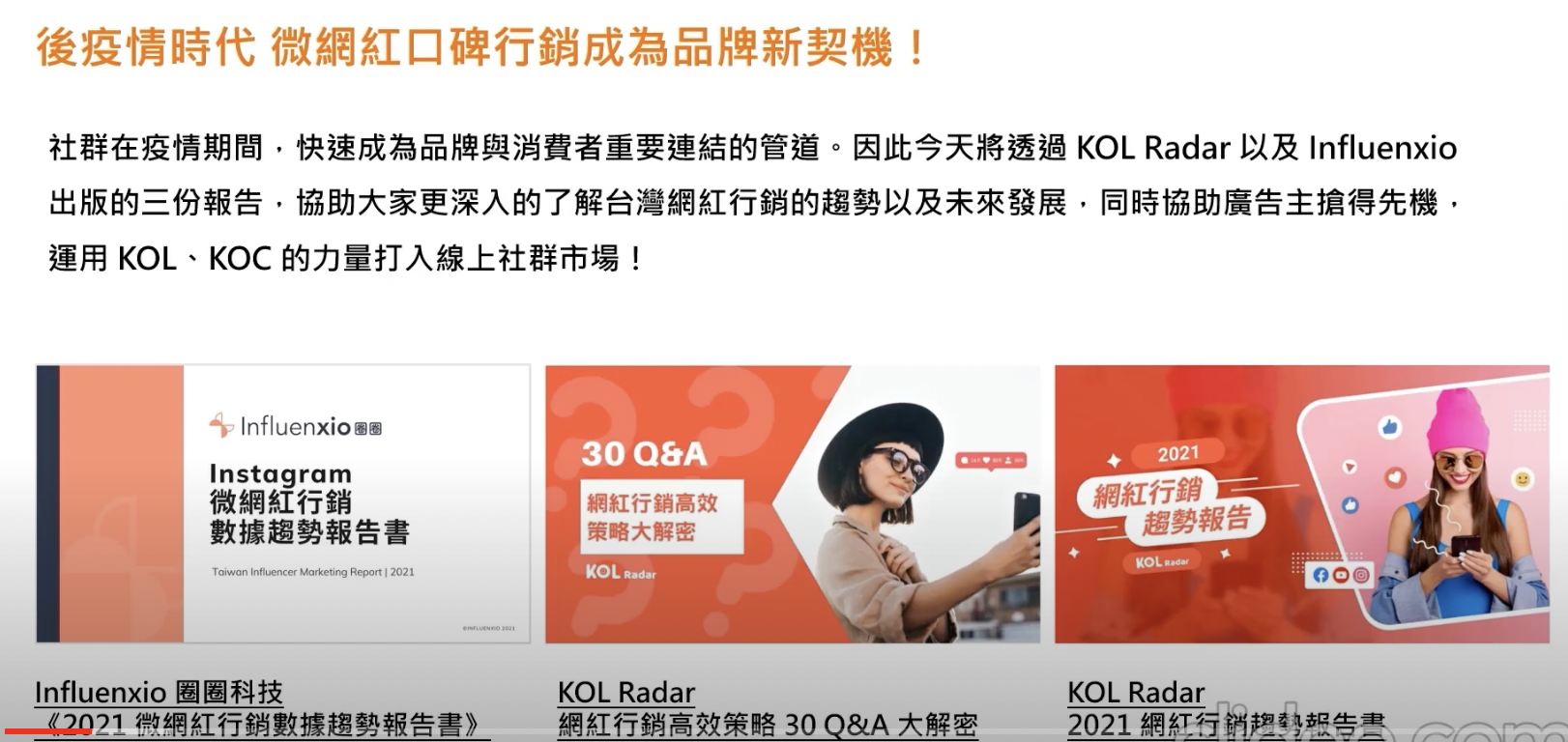 2020年開始,受到新冠疫情的影響,不僅衝擊了全球經濟,消費者習慣也隨之改變。而社群在這段期間,也快速成為品牌與消費者重要連結的管道。因此今天將透過KOL Radar以及Influenxio出版的報告,協助大家更深入的了解台灣網紅行銷的趨勢以及未來發展,同時協助廣告主搶得先機,運用KOL的力量打入線上社群市場!
