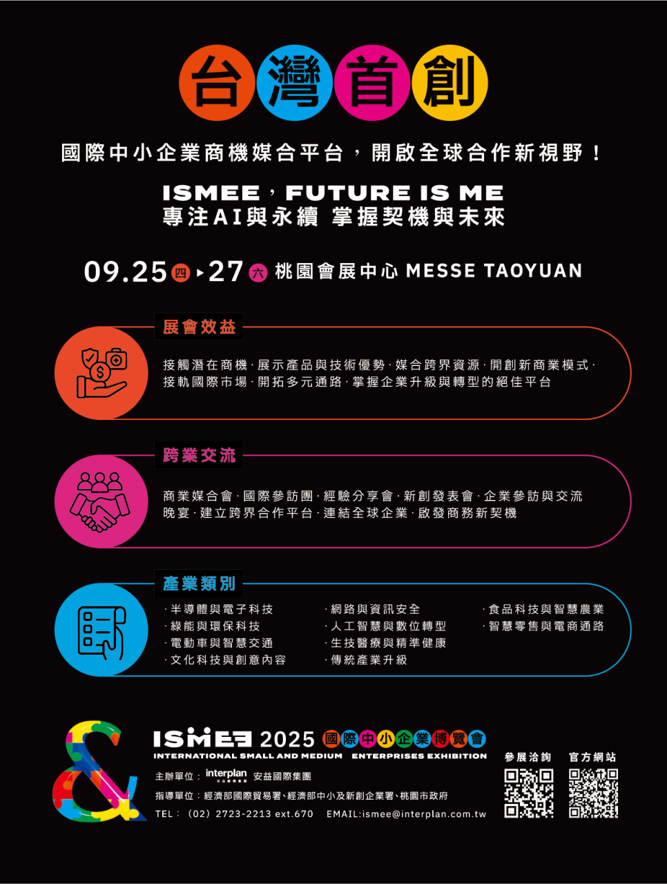 在全球供應鏈重構與國際經貿重新洗牌之際,中小企業正面臨前所未有的轉型壓力與國際拓展契機。ISMEE 2025 應勢而生,打造超越產業邊界的跨域商務平台,匯聚品牌行銷、製造創新、數位升級與永續轉型的最佳實踐,呈現企業韌性與市場適應力。
