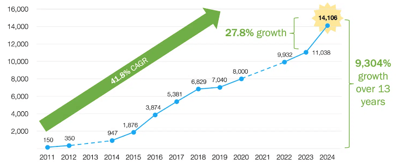 MarTech 工具在過去幾年,不斷地成長,2024 年,年複合增長率為 41.8%,在過去的 13 年裡成長了驚人的 9,295%。