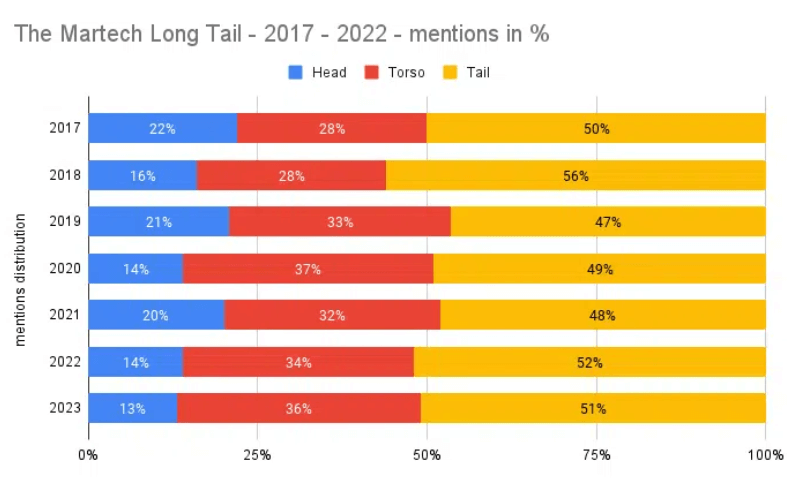 MarTech 分子化描述了眾多小型專業工具在技術堆疊中的重要性。與其他市場相同,MarTech 也呈現長尾效應。近期研究指出,在過去七年中,這些小型長尾工具的貢獻率穩定在 50%,顯示它們在企業技術堆疊中扮演著關鍵角色。這一現象持續存在,即便是在大型供應商購併小型供應商並以大平台為主的情況下。
